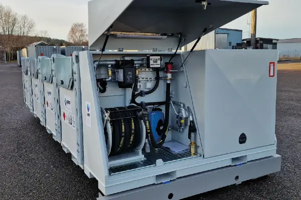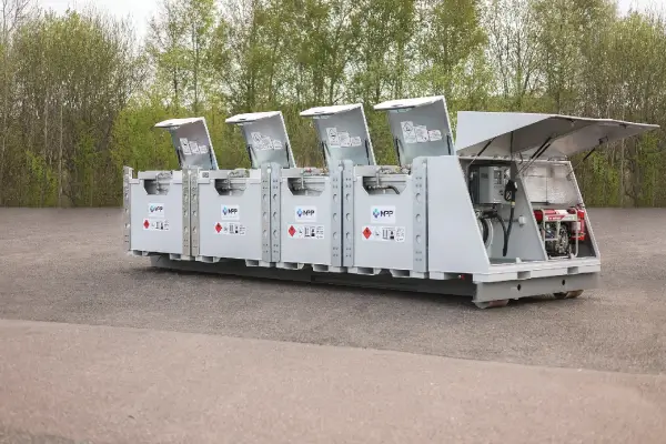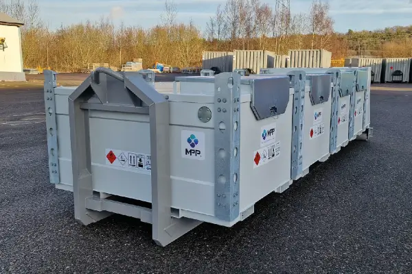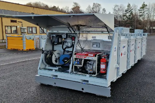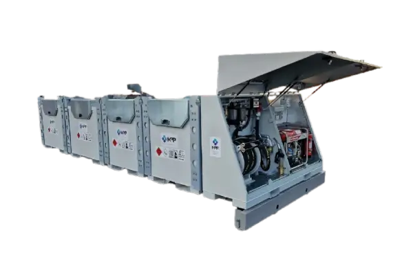 TTC Fuel Farm is a mobile refueling solution developed to quickly handle and transport large volumes of fuel within critical operations, municipal emergency preparedness, or as a fueling station for construction sites where contractors want to consolidate purchases and achieve safer and smoother refueling. TTC Fuel Farm can be adapted to dispense various fuels such as HVO, diesel, petrol, and AdBlue®. The tanks can also be connected to be handled as a larger tank for supplying different units. The configuration shown in the image has a total volume of 11,000 liters with TTC 3+3+3+2 m³ tanks mounted on a 6-meter hooklift frame. MPP's fuel farm gasoline 10000 liters solution is engineered for high-volume operations - explore our Portable Fuel Tanks for compatible mobile storage options. TTC Fuel Farm is adapted for: construction sites, rental, power & backup power, emergency preparedness management, municipalities, civil engineering & infrastructure, and construction heating.